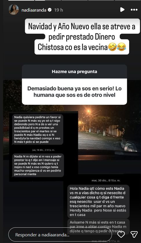 Prácticamente es un acoso lo que sufre por parte de su vecina. Reiteradas veces le envía mensaje pecheándole plata antes de devolverle lo que le debe. Nadia he’i que va a tirar hína su nombre.