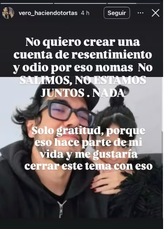 “Yo sé que no pega, pero él me ayudó con el alcoholismo. No quiero crear una cuenta por resentimiento y odio, por eso nomas. No salimos, no estamos juntos. Nada. Solo gratitud, porque eso hace parte de mi vida y me gustaría cerrar este tema con eso”, le bajó Verónica.